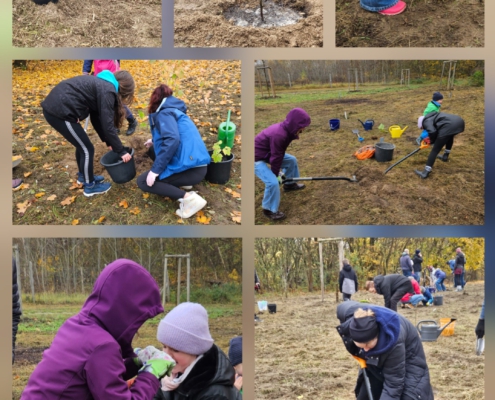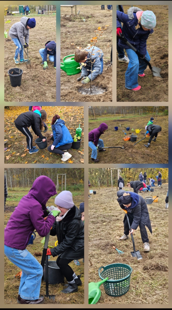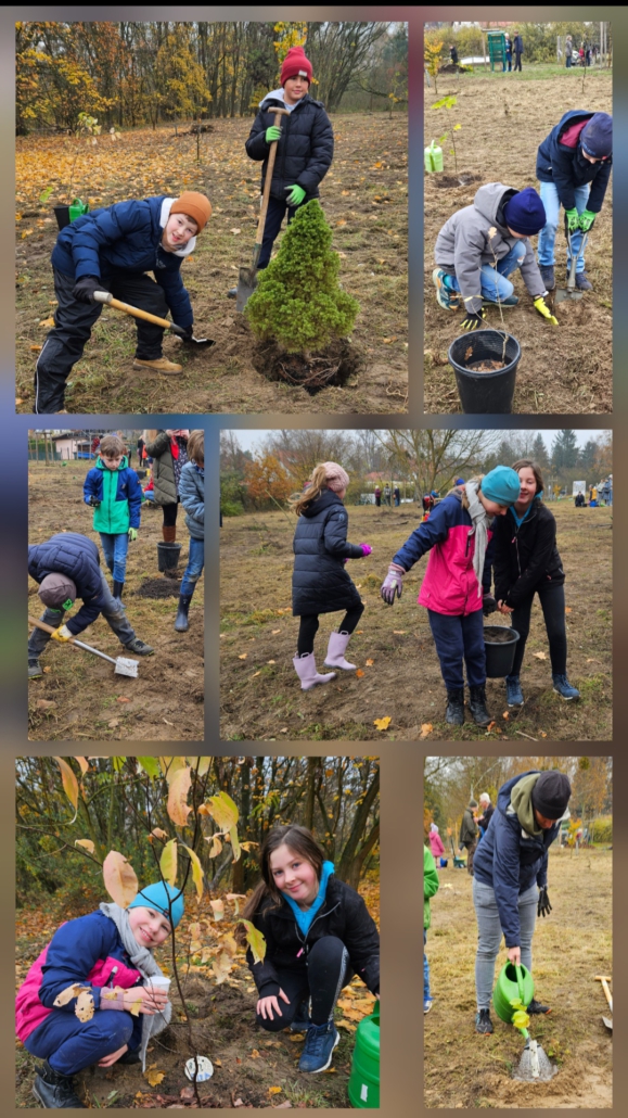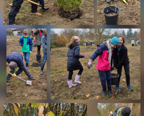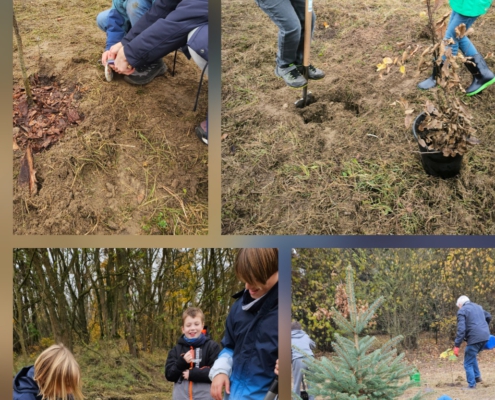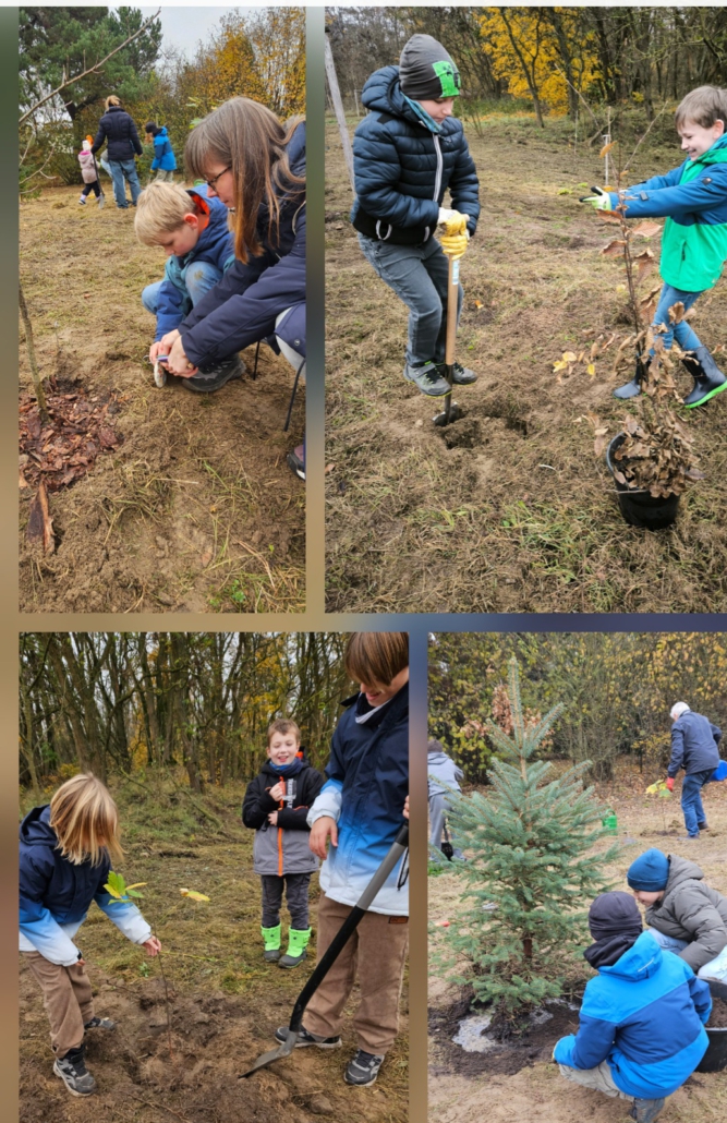 Am Samstag, d. 08. 11. 2025, beteiligten sich alle Kinder der Klasse 4a mit ihren Eltern, Omas, Opas und der Klassenlehrerin Frau Trautermann an einer Baumpflanzaktion im Kinderstadtwald Falkensee.